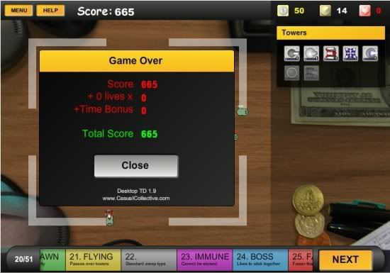 Apabila Anda memiliki waktu luang, saya sangat menyarankan Anda untuk mencoba mengunjungi situs ini. Saya mencoba memainkan Desktop Tower Defense kemarin, dan langsung ketagihan! Nilai terbaik saya adalah 665 dalam mode "Regular", bagaimana dengan Anda?